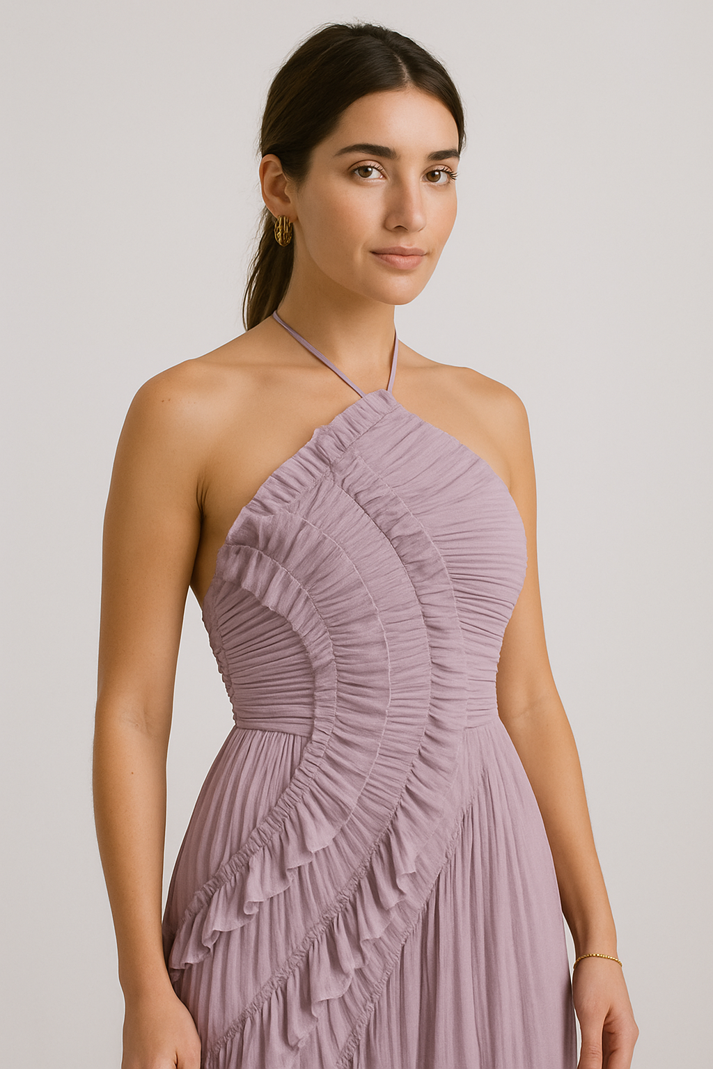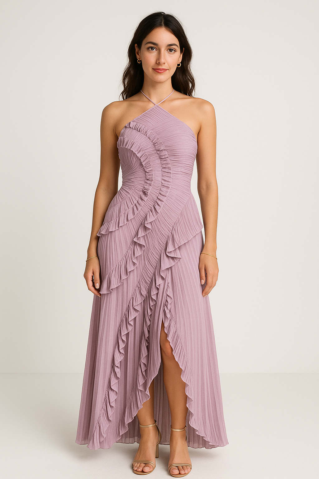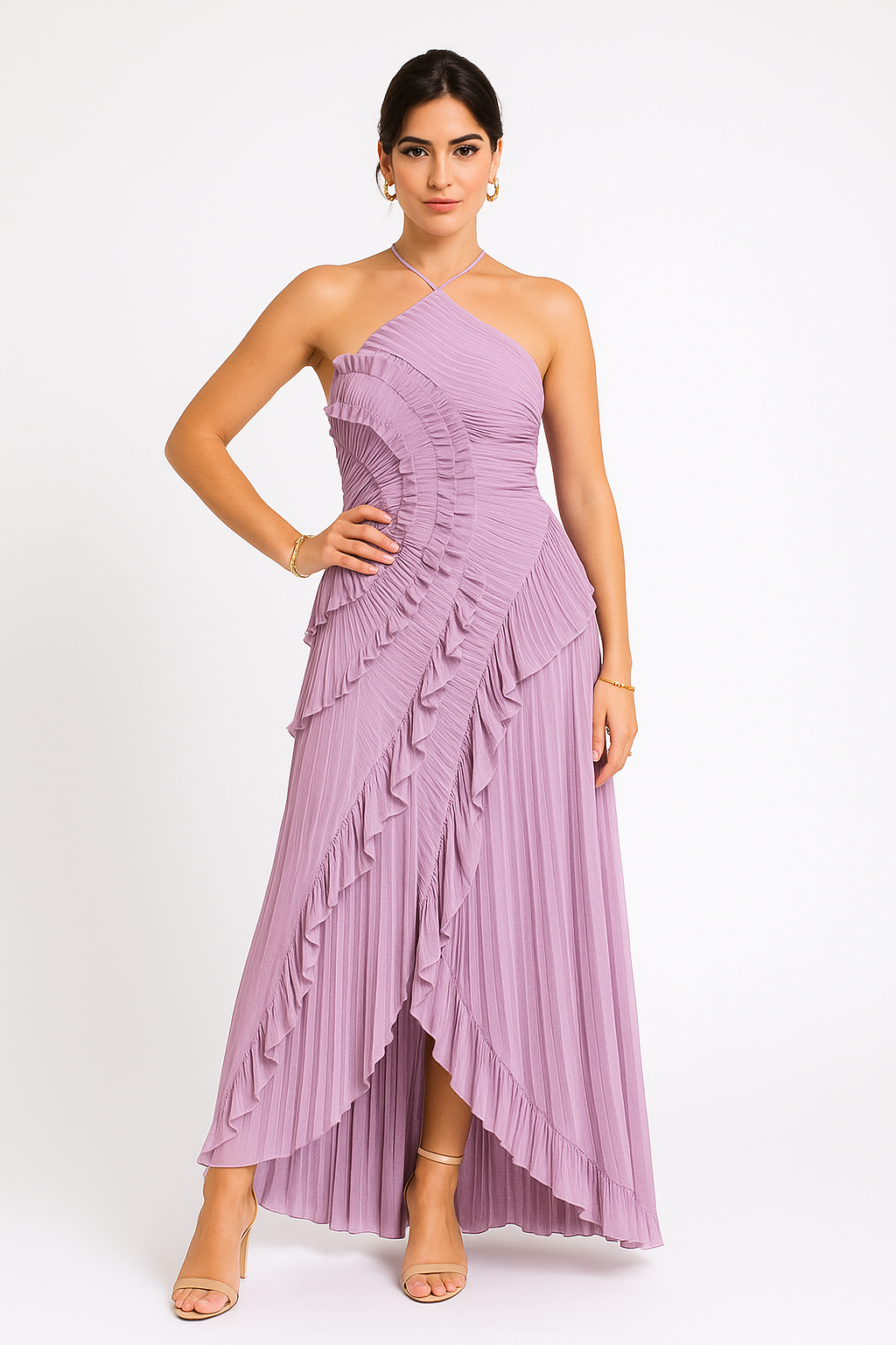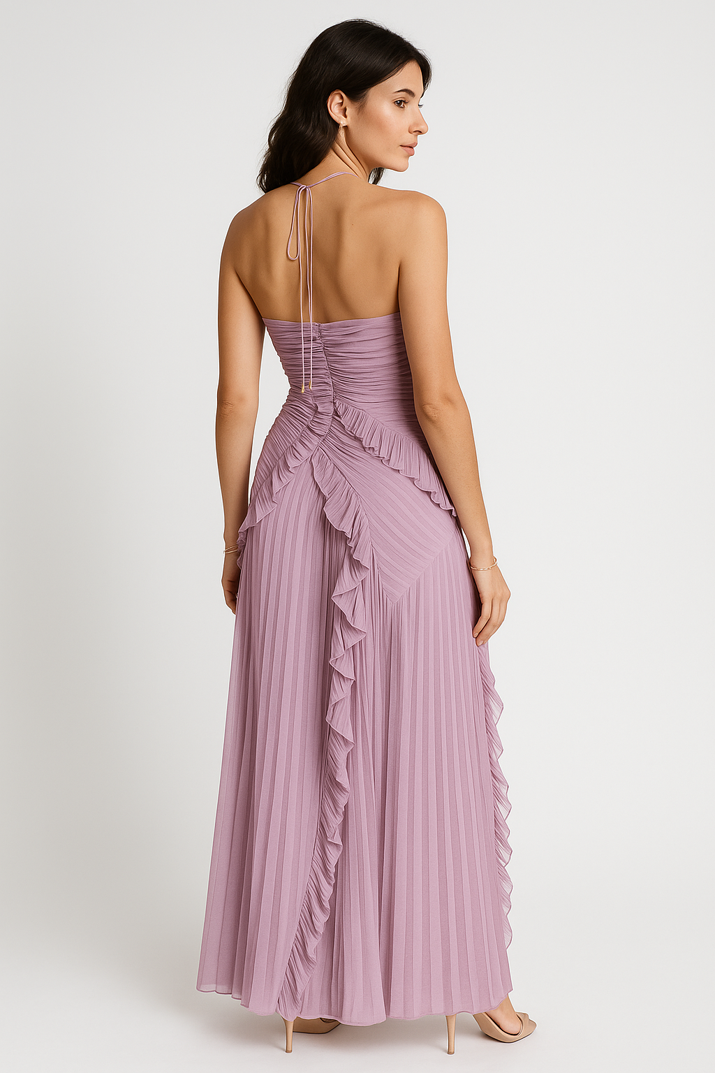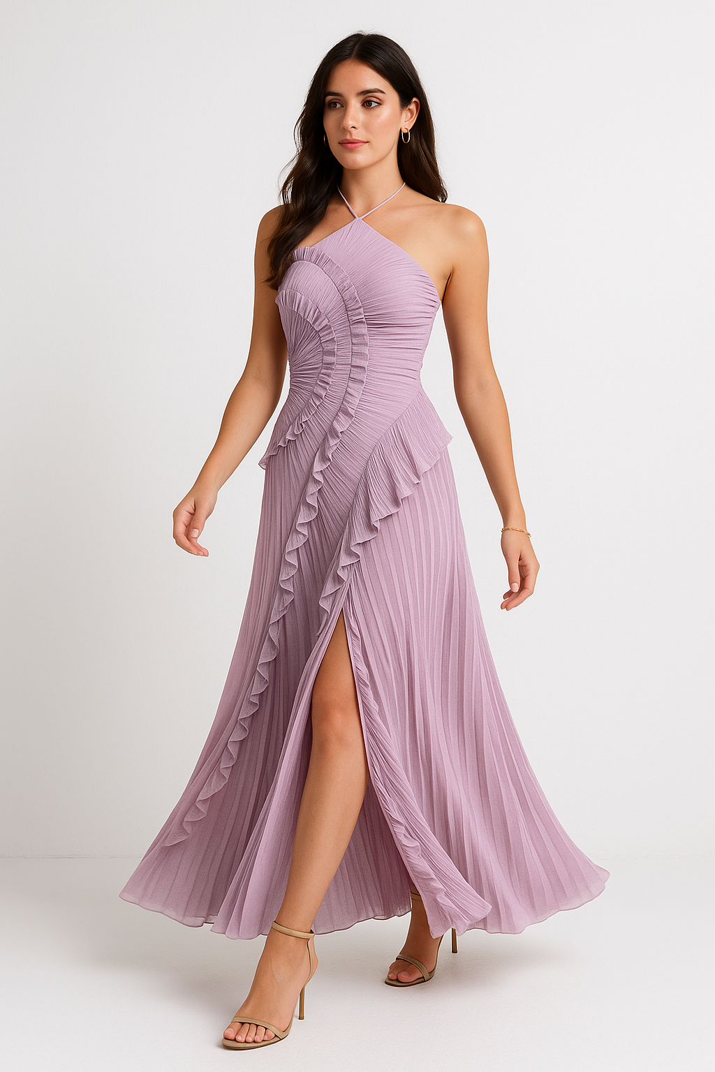 Dramatic, dreamy, and undeniably romantic — SELESTIA brings every moment to life. Sculpted pleated waves trace your curves with soft intensity, while the flowing skirt moves with effortless poetry. The halter neckline adds sensual elegance, and the front slit offers just the right touch of allure. Every step feels cinematic, every glance a story — bold femininity with a hint of magic. Pure Vilenaa romance.